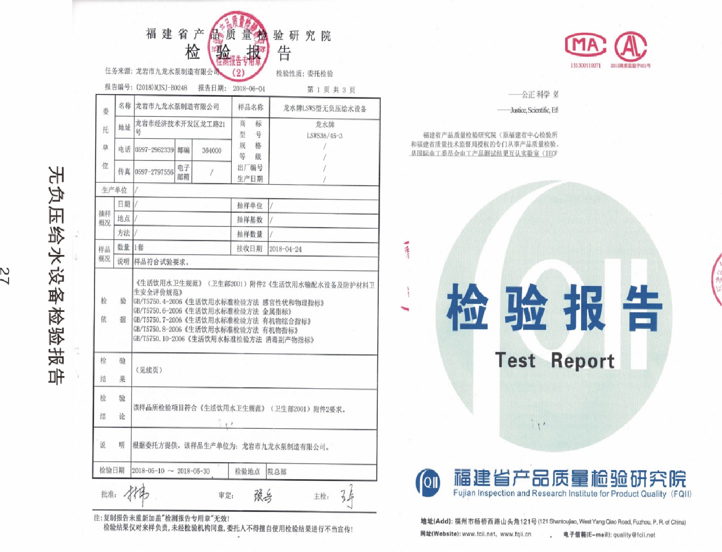 無負(fù)壓給水設(shè)備檢驗(yàn)報告