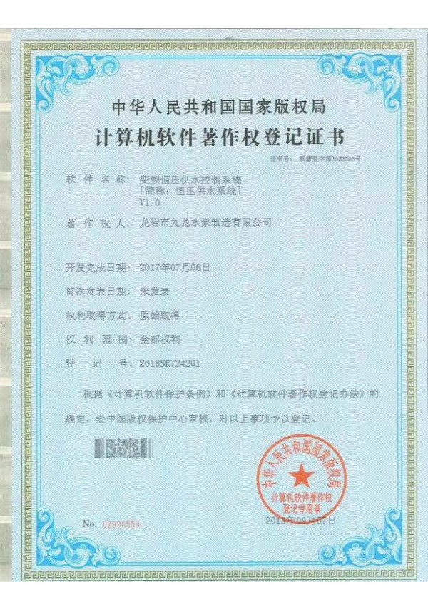 變頻恒壓供水系統軟件著作權證書
