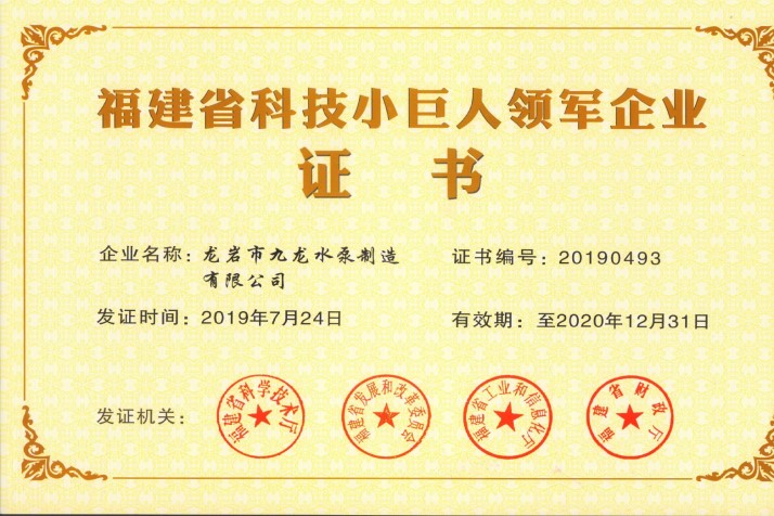 福建省科技小巨人領軍企業證書
