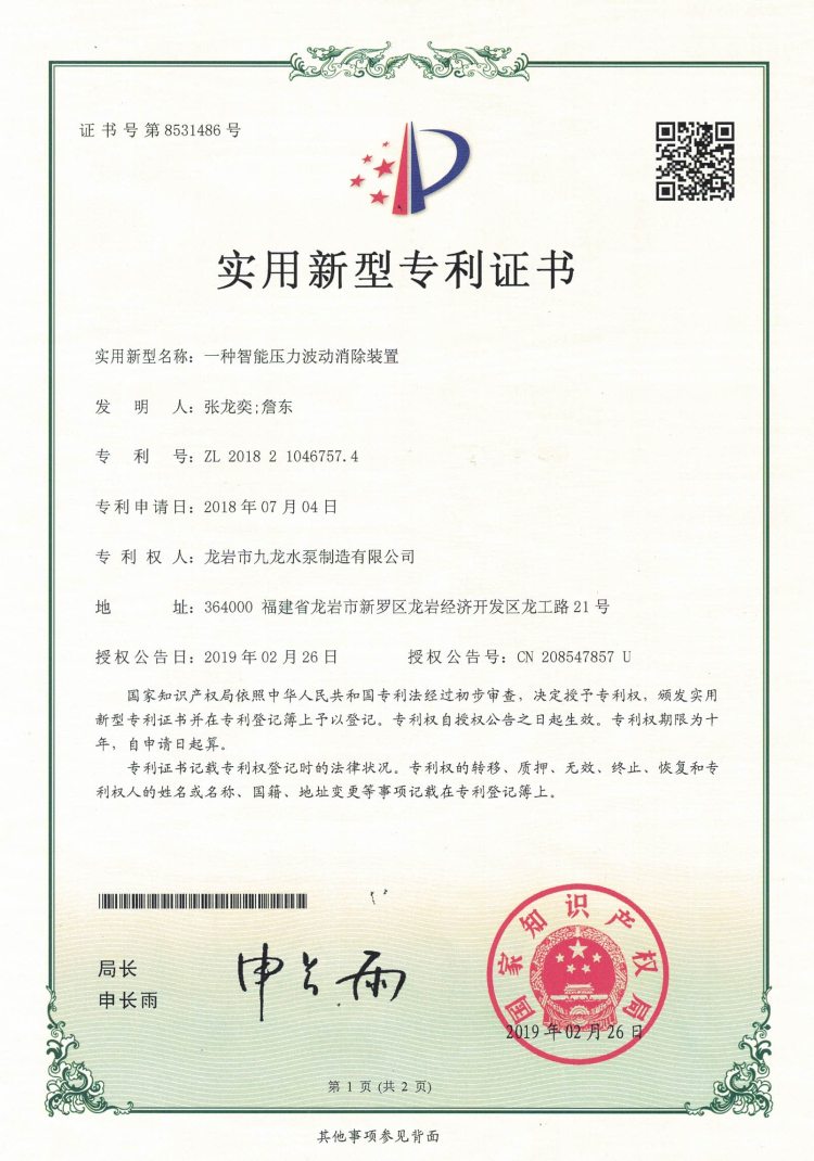 智能壓力波動消除裝置實用新型專利證書