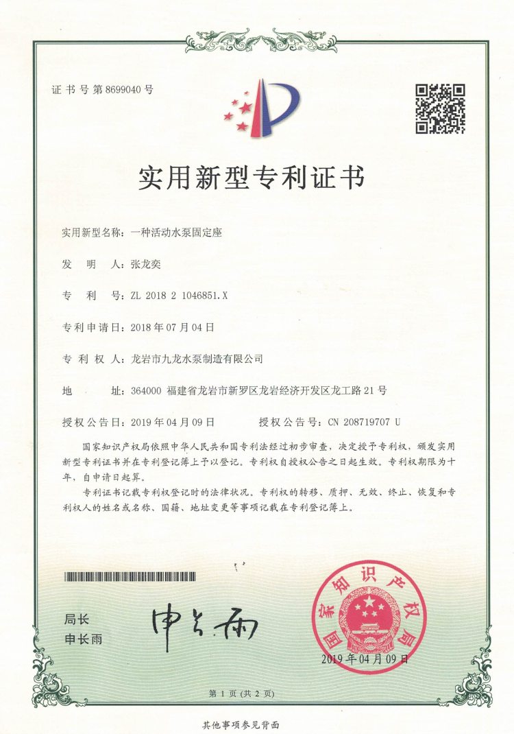 活動水泵固定座實用新型專利證書