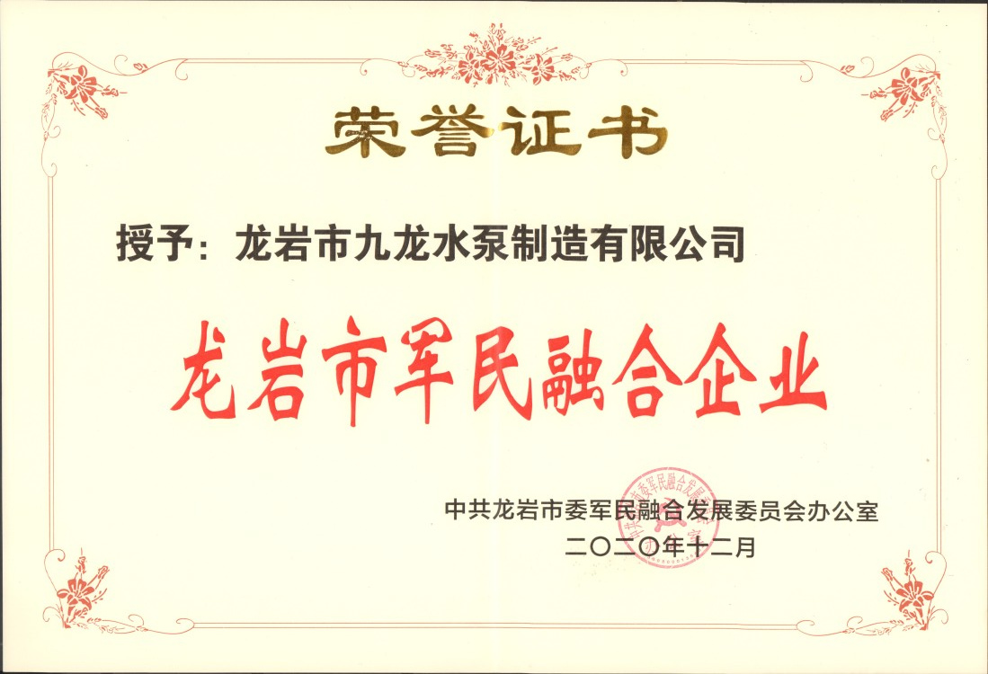 龍巖市軍民融合企業榮譽證書
